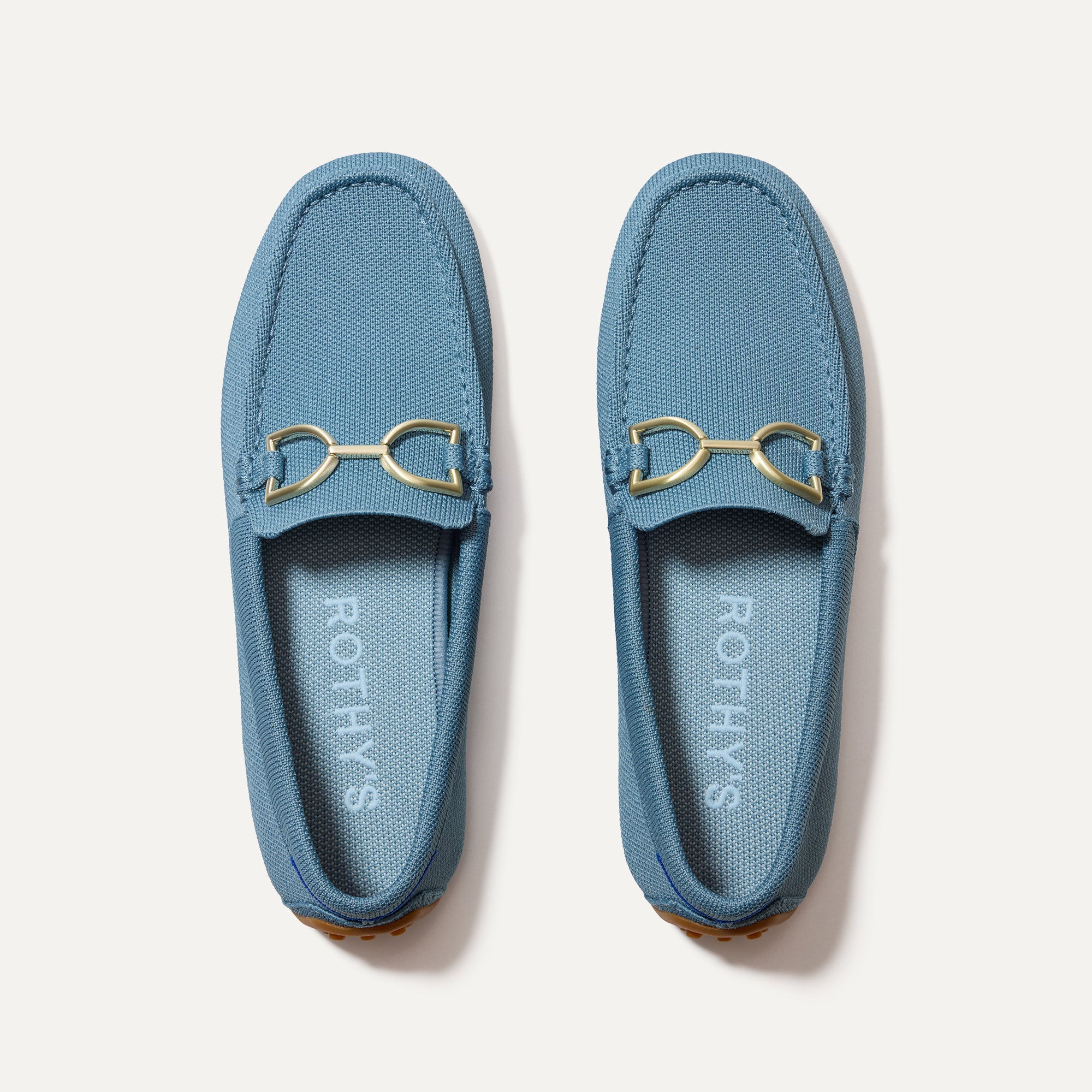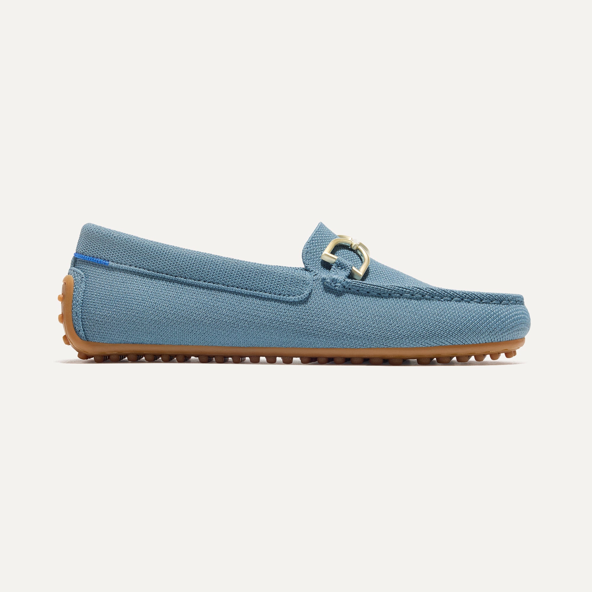 - Soft. flexible upper in sky blue with a gold hardware signet bit on the vamp.