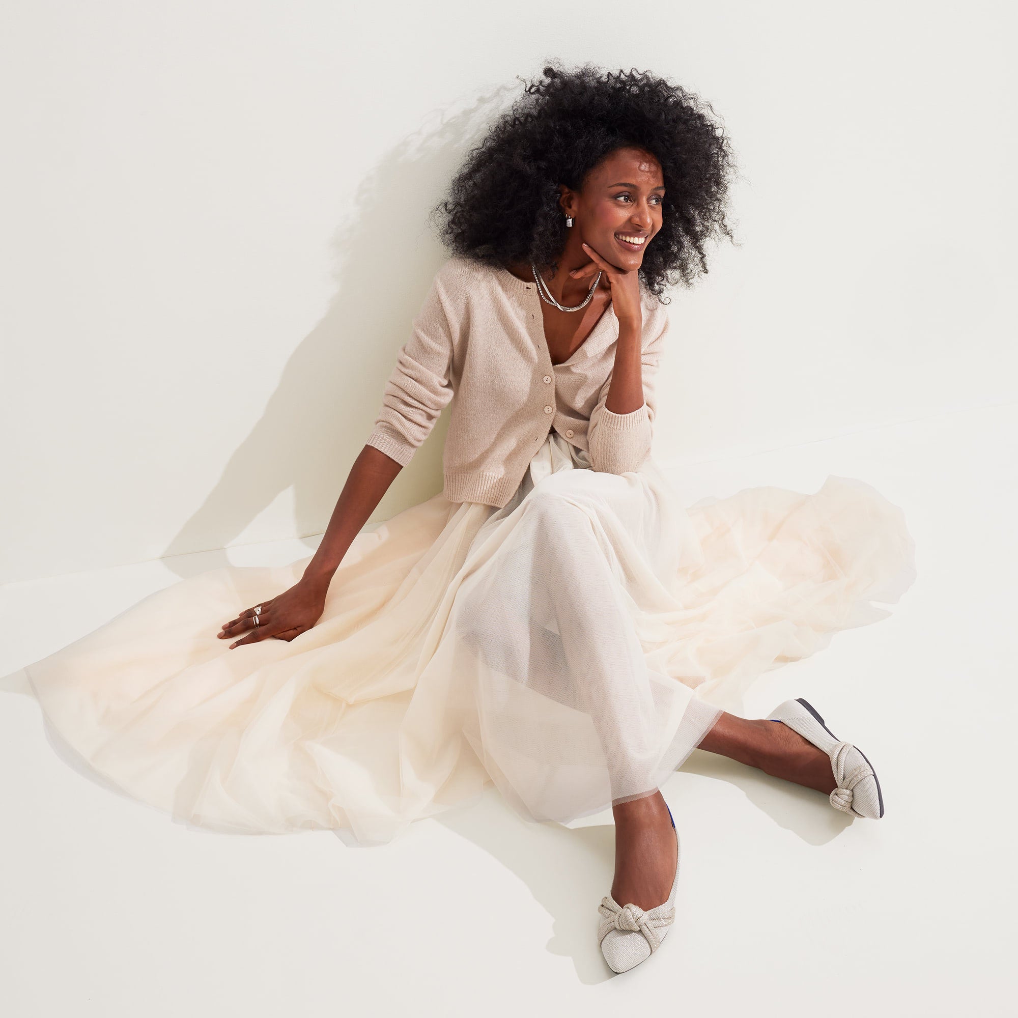 - Premium knit upper in soft platinum shimmer with a knot on the vamp.