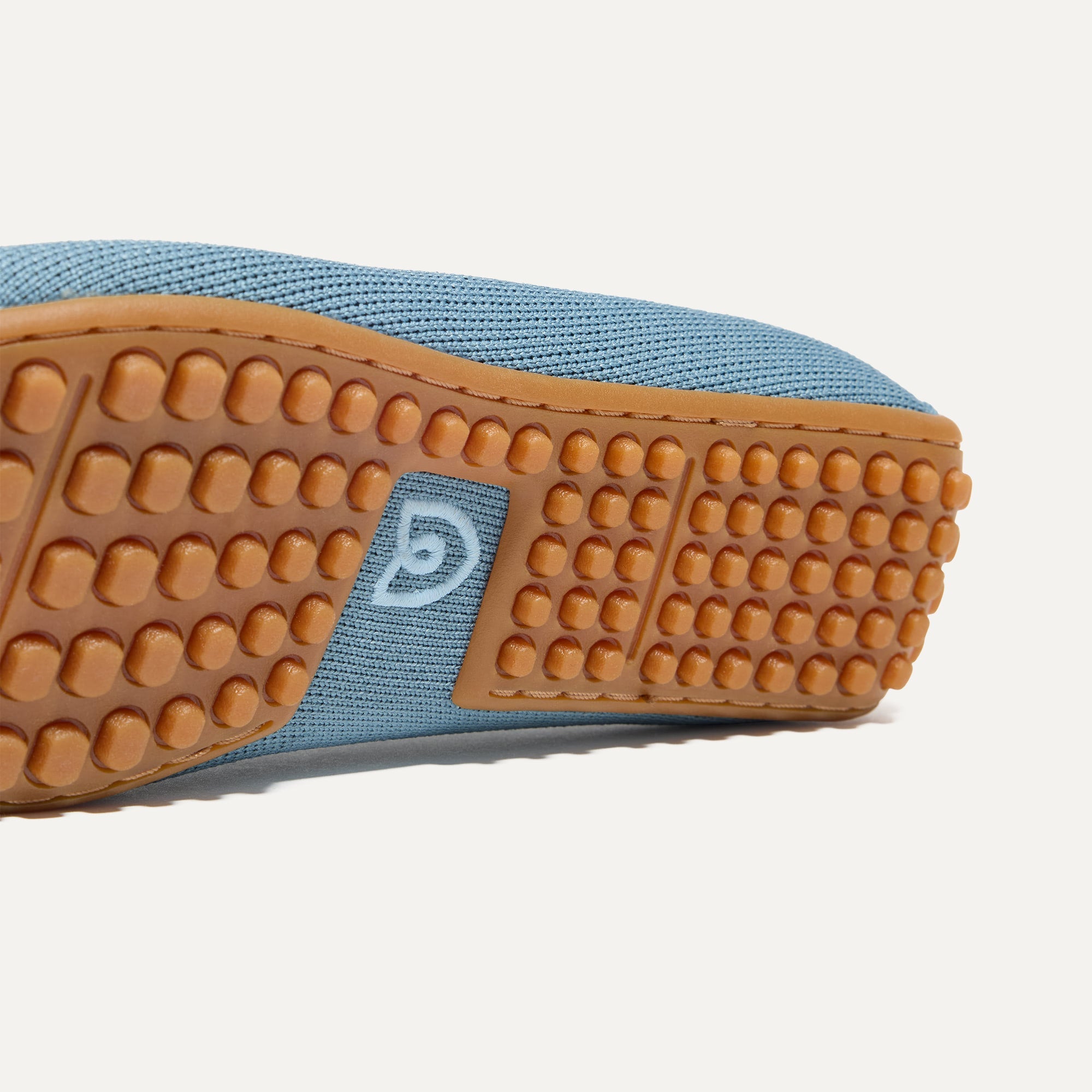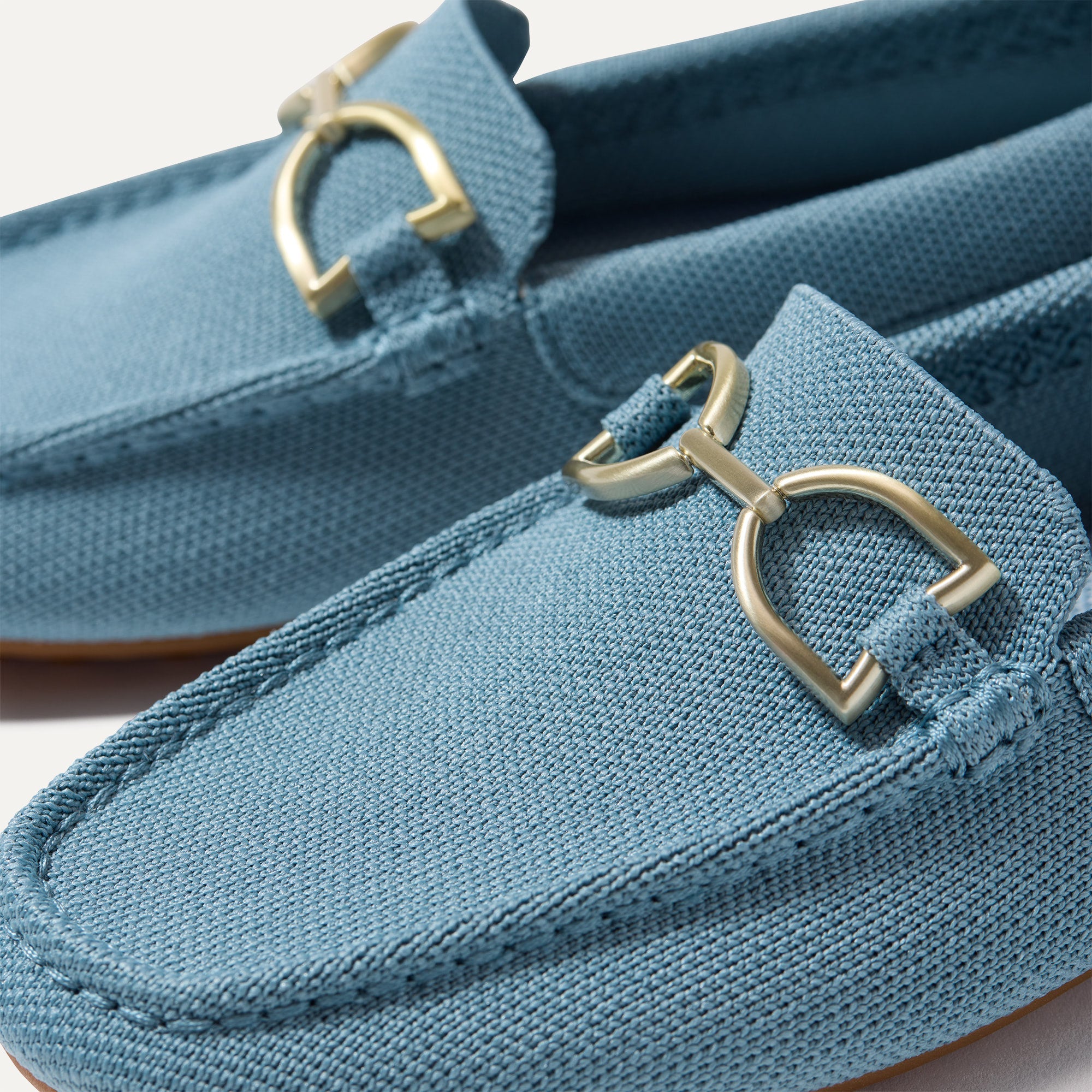 - Soft. flexible upper in sky blue with a gold hardware signet bit on the vamp.