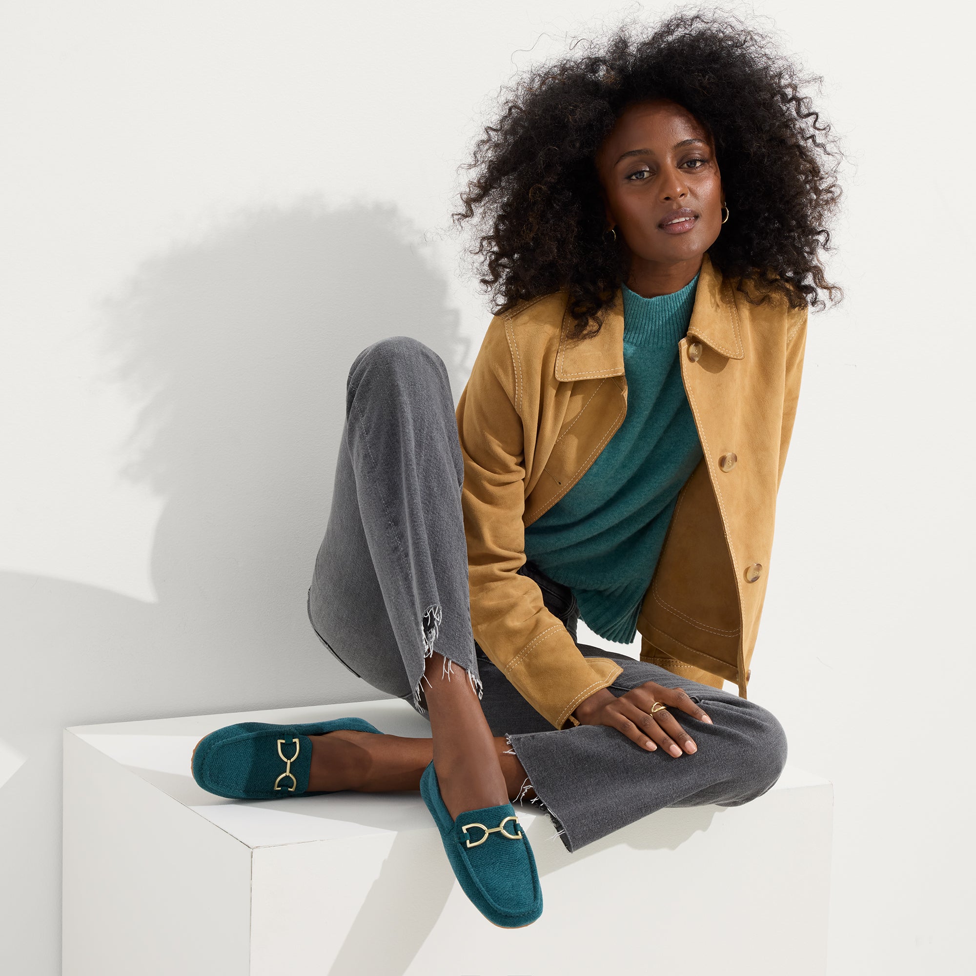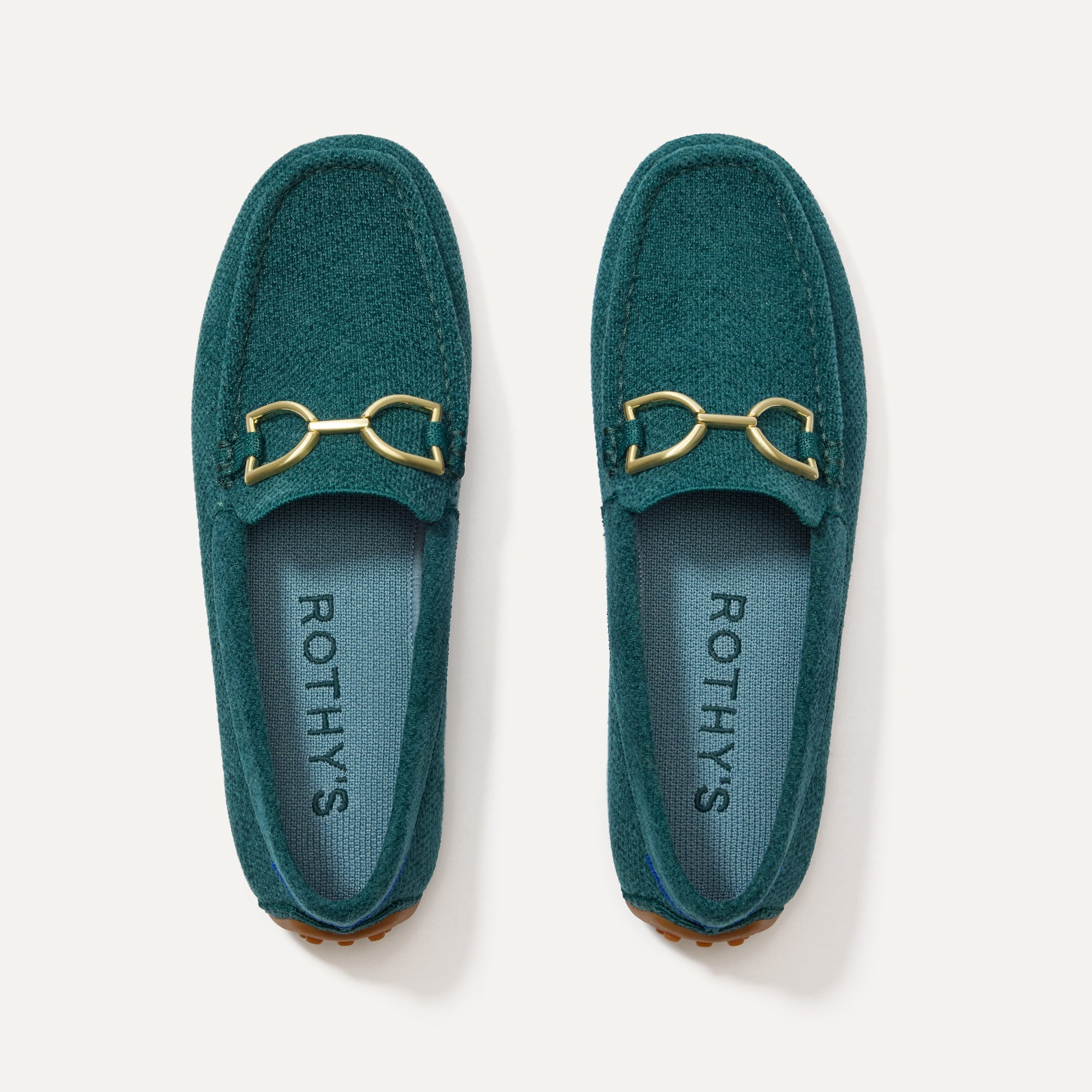 - Soft. flexible upper in jade green with a gold hardware signet bit on the vamp.